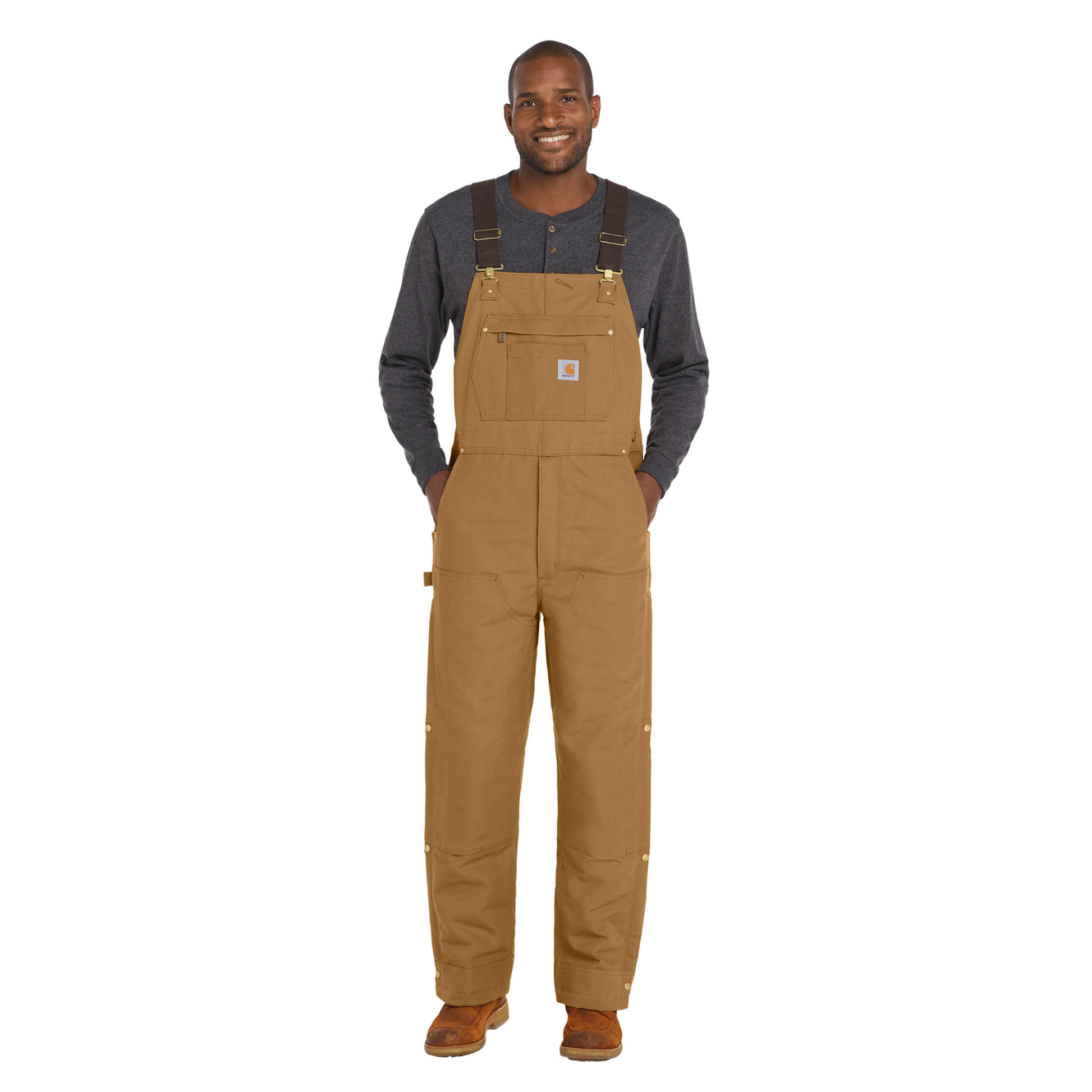 - Carhartt label sewn on bib pocket